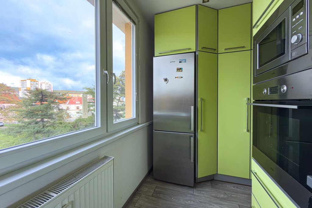 Velkým plusem je vlastní komora přímo v bytě, další komora v mezipatře a také sklep, takže o úložný prostor rozhodně není nouze. Byt má plastová okna a prodává se částečně zařízený – vybavený vším, co vidíte na fotografiích.