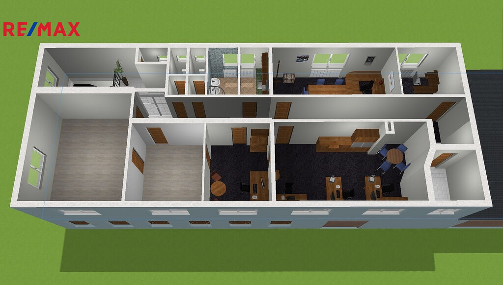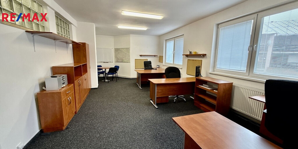 V případě zájmu je možné využít i kanceláře přes chodbu (dle půdorysu A+A o výměře 29 m², jsou součástí samostatného inzerátu) nebo i prostornou garáž o výměře 214 m² a dvůr o výměře 1000 m² (samostatný inzerát).