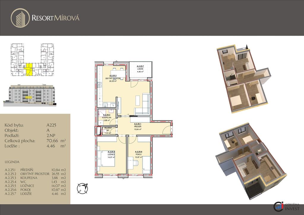 Nabízíme vám k prodeji bytovou jednotku o dispozici 3+kk o velikosti 70,66 m² + lodžie o velikosti 4,46 m² v novostavbě projektu Resort Mírová. Tato bytová jednotka se bude nacházet v 2.NP a bude situována na severozápad.