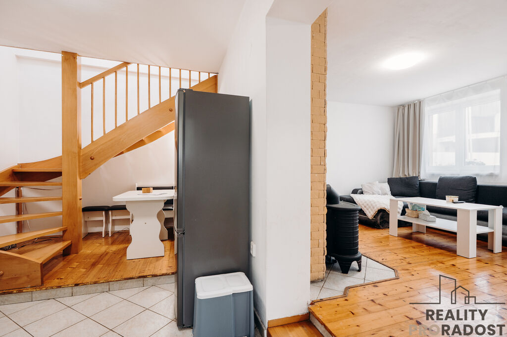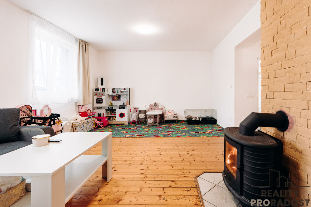 1. NP: prostorný obývací pokoj s kuchyňským koutem, samostatná toaleta a koupelna.