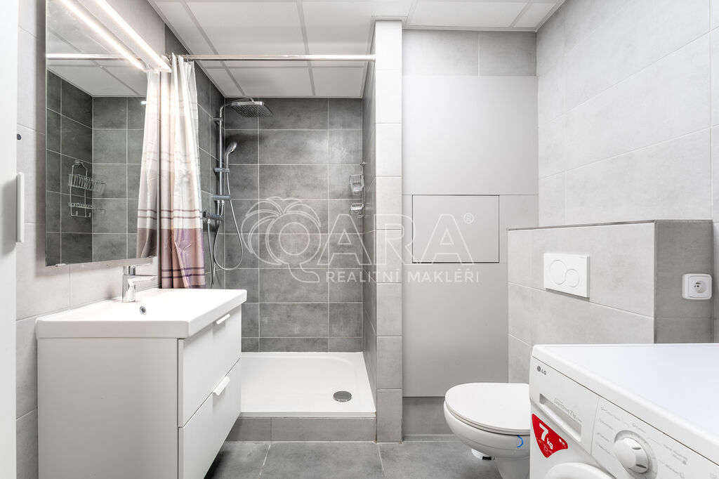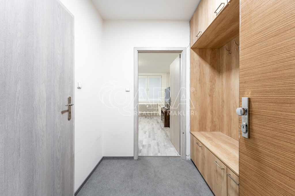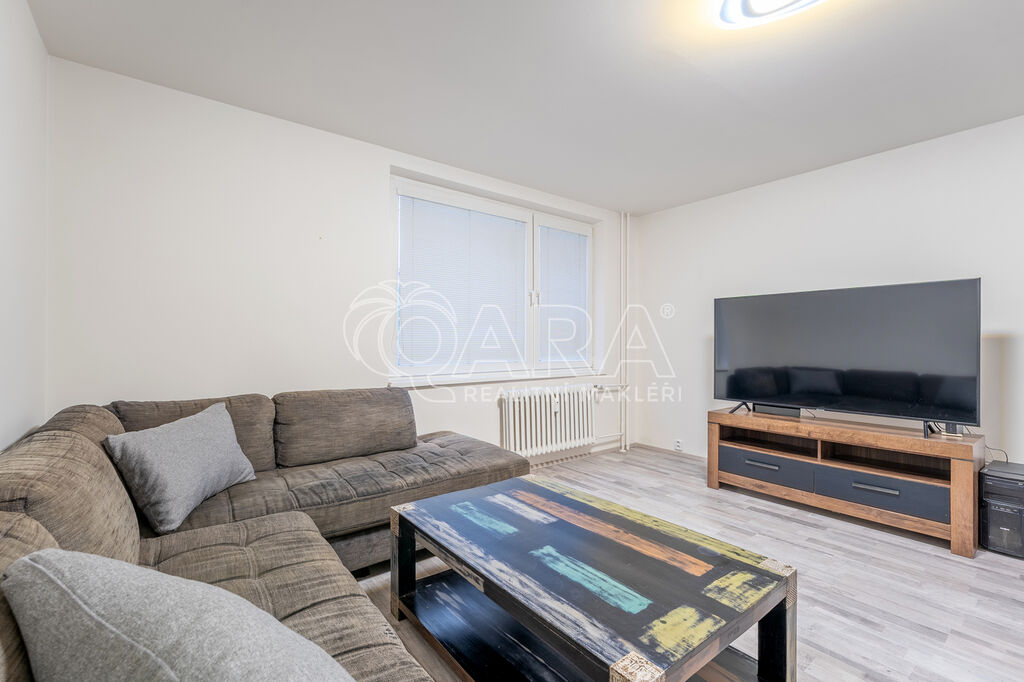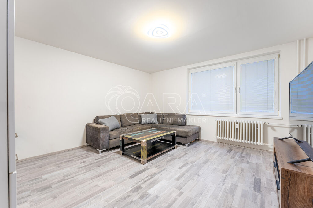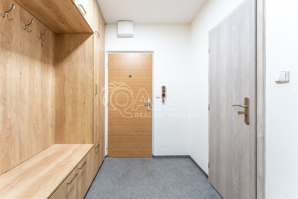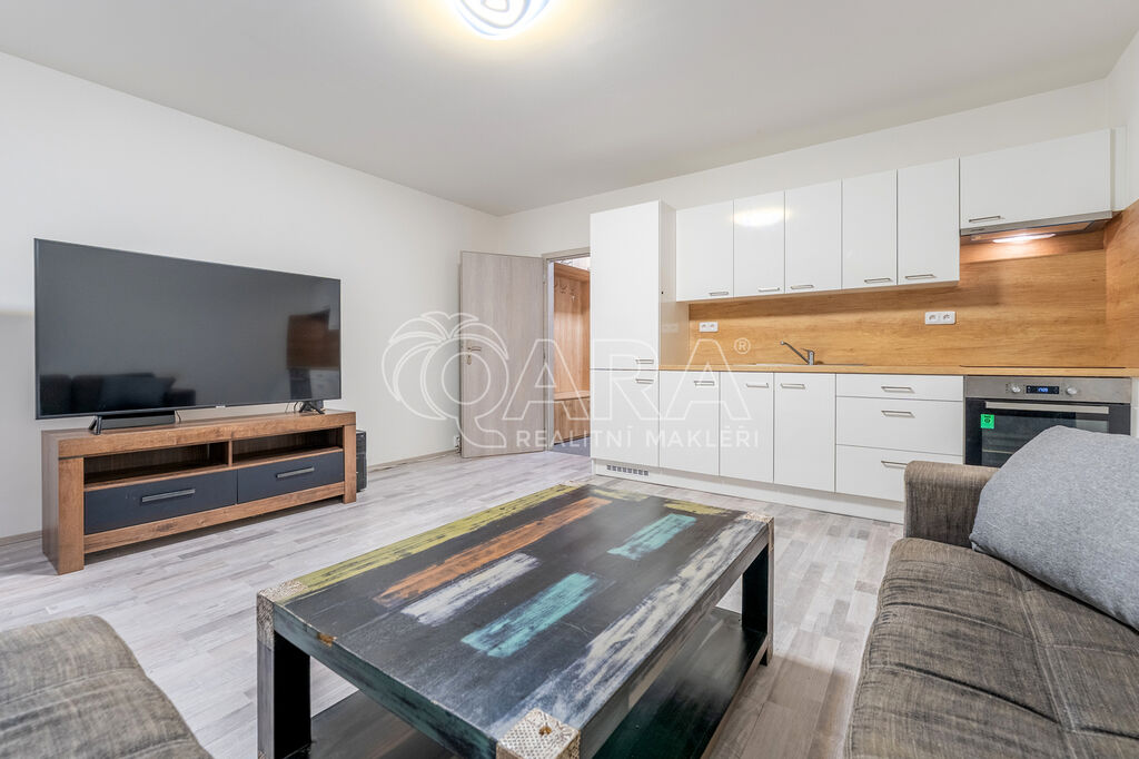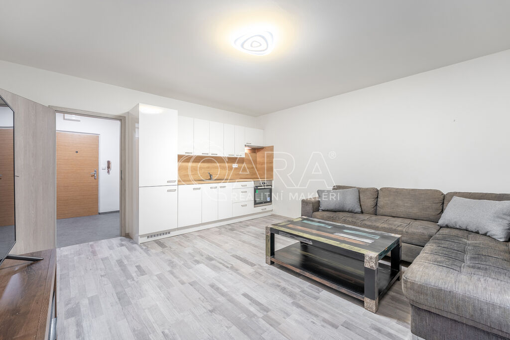 Podlahová plocha bytu je 30 m² a nachází se v 2. NP panelového domu. Skládá se z předsíně o výměře 4,7 m², kde se nachází vestavěná předsíňová skříň s botníkem. Kuchyně je spojená s obytnou částí a je zařízena novou kuchyňskou linkou s vestavěnou lednicí s mrazákem, elektrickou troubou se indukční varnou deskou a digestoří (myčka není k dispozici). Místnost má 21,5 m² a mimo kuchyňskou linku se spotřebiči se podnajímá nezařízená, tím pádem si vše ostatní můžete zařídit podle svých vlastních představ. Z předsíně je přístupná také koupelna, který je vybavena prostorným sprchovým koutem, umyvadlem, skříňkou pod umyvadlem, zrcadlem a WC. Přípojka na pračku i dostatek místa na sušičku je samozřejmostí (tyto spotřebiče nebudou součástí podnájmu).