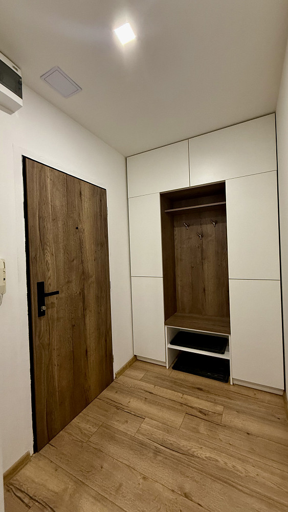 V předsíni nutno vyzdvihnout skříně na míru i předsínovou stěnu.