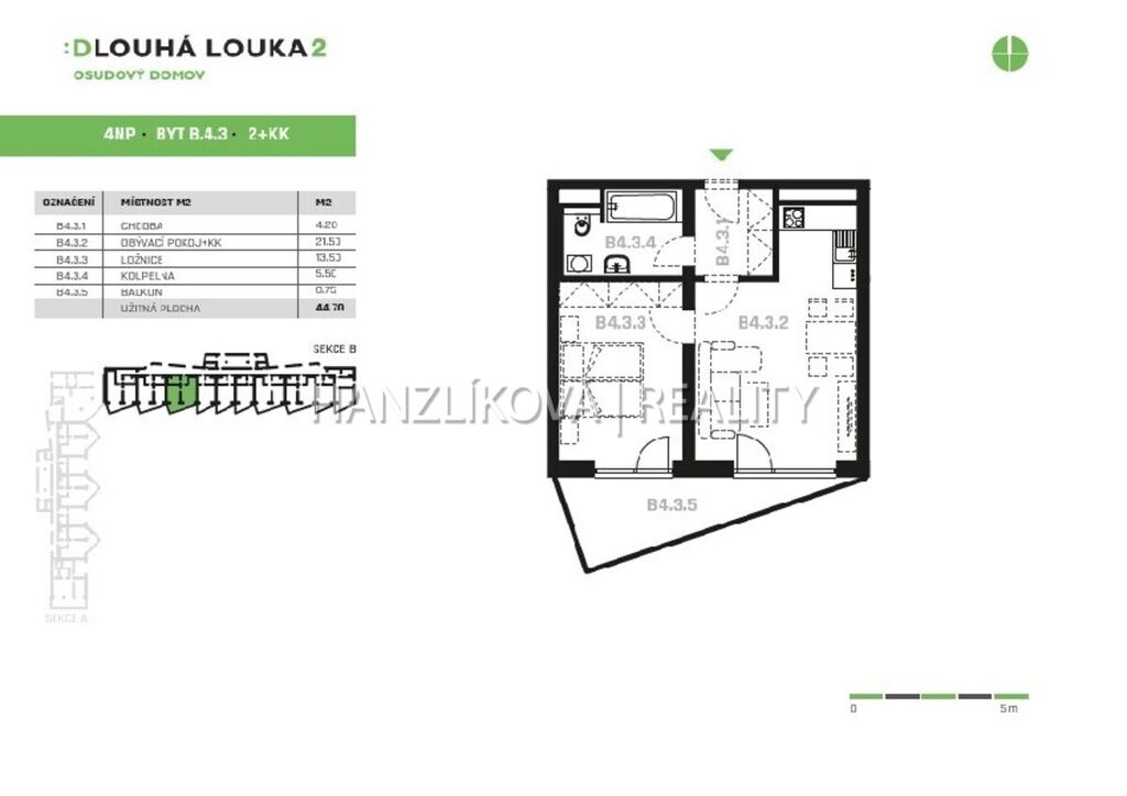Nabízíme k pronájmu jednotku číslo B.4.3. Jedná se o byt 2+kk o výměře 44,70 m2 + terasa 8,70 m2, který se nachází ve 4.NP nového rezidenčního komplexu DLOUHÁ LOUKA 2.etapa. Byt se skládá z: chodby, koupelny s toalety, jednoho samostatného pokoje a prostorného obývacího pokoje s kuchyní. Byt je orientovaných na východ. Z obývacího pokoje a ložnice je přístup na terasu (8,70m2) . Byt je částečně zařízený ( vestav. skříně v ložnici a předsíni, pračka, lednice,).