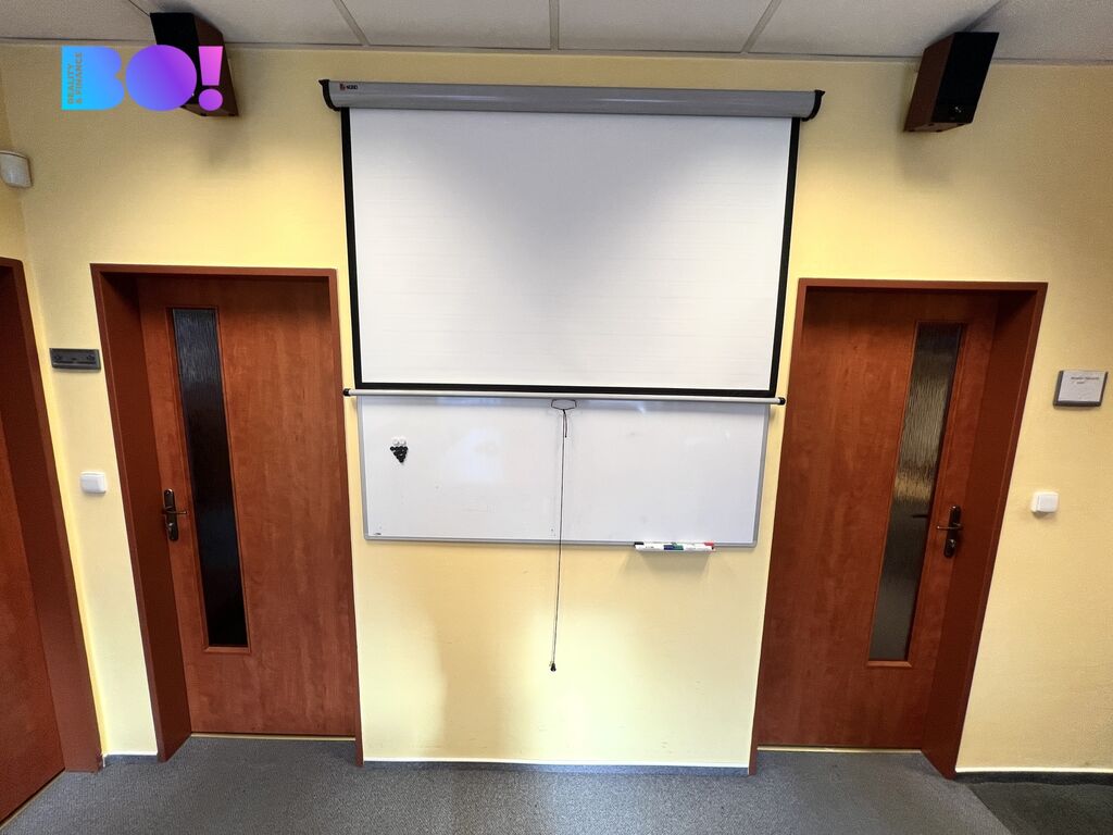 Prostory jsou téměř kompletně vybavené – kuchyňská linka včetně spotřebičů, klimatizace, a také projektor s promítacím plátnem pro prezentace či porady.