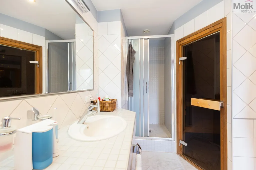 Nabízí tři samostatné pokoje, kuchyň, koupelnu s vanou a vířivkou, saunu a velkou technickou místnost, ve které je pračka, sušička, žehlící prkno i věšák na prádlo. Celý byt působí velmi útulně, je světlý, moderní a prakticky řešený.