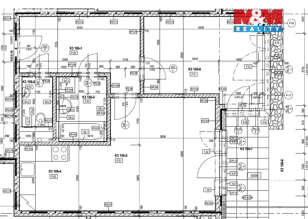 Skládá se ze vstupní haly s vestavnou skříní, ložnice a obývacího pokoje s kuchyňským koutem. Dále koupelny s vanou a samostatné toalety.