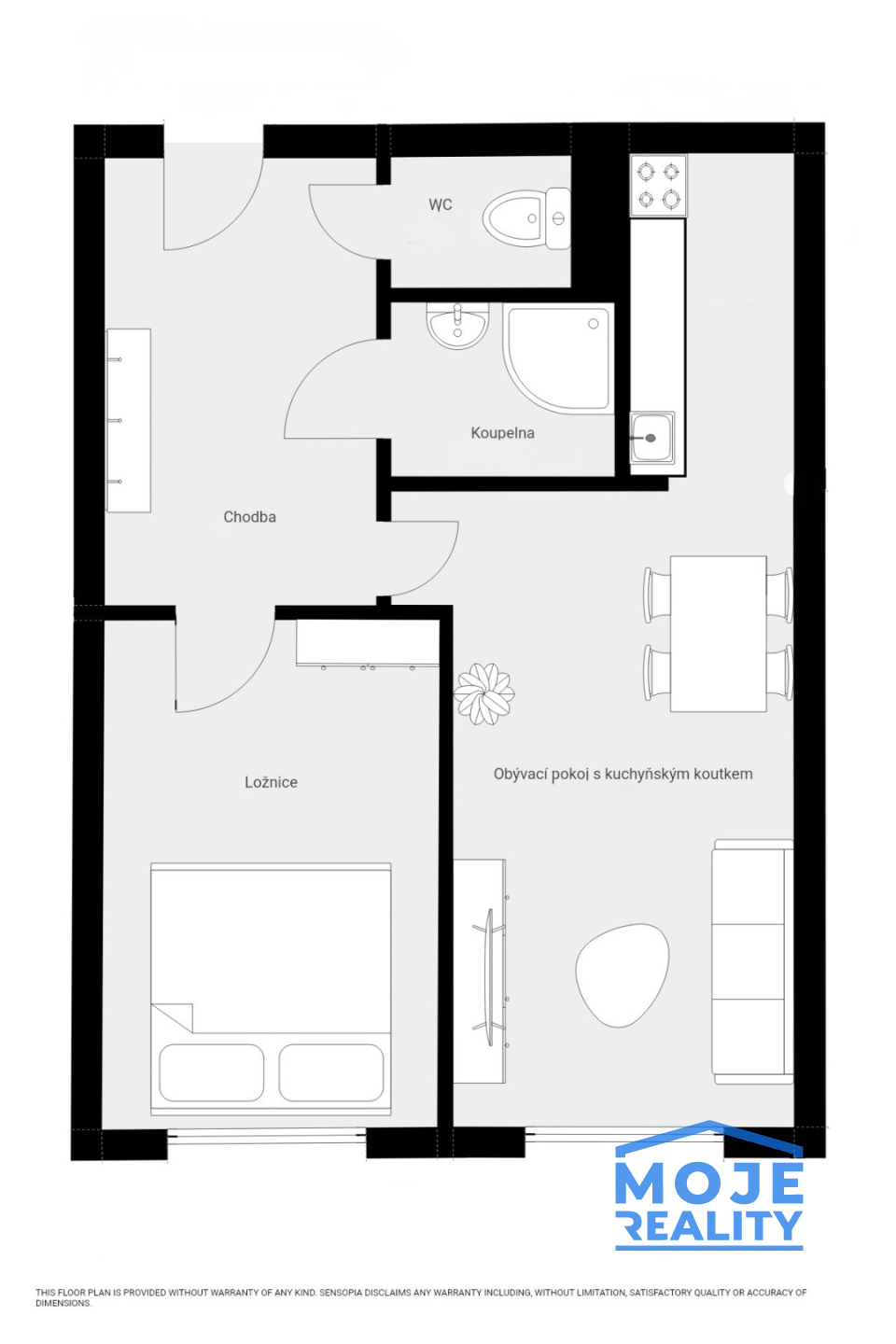 Byt tvoří prostorná vstupní chodba, ze které je vstup na toaletu, do koupelny se sprchovým koutem, ložnice a obývacího pokoje s kuchyňským koutem vybaveným sporákem a digestoří. K bytu náleží sklepní kóje o velikosti 2 m².