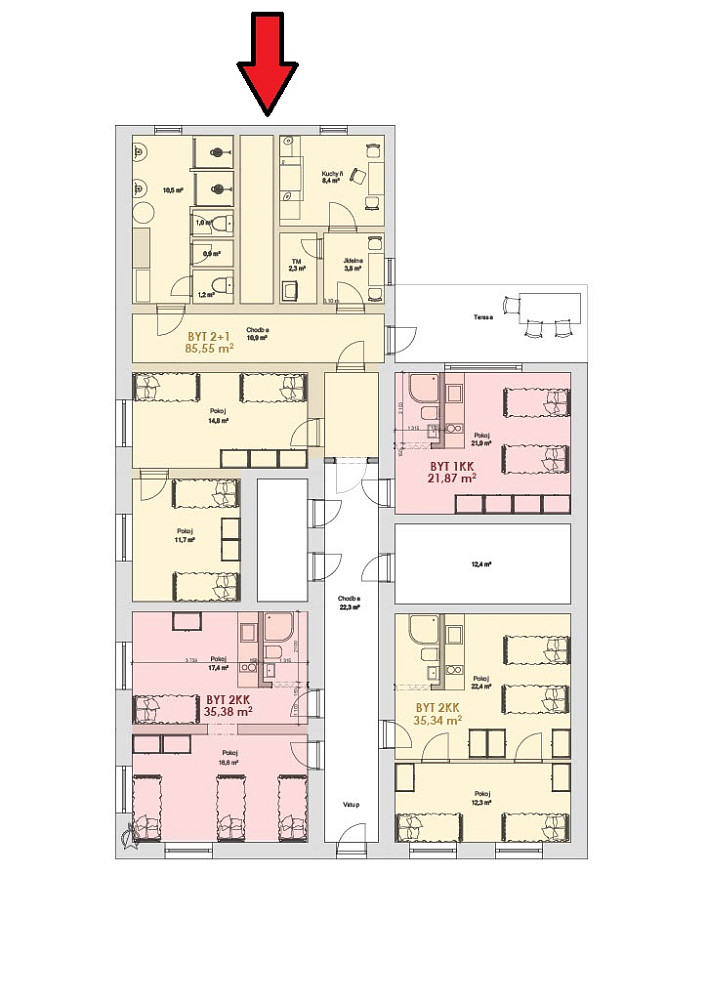 Světlý byt s výhledem do zeleně, dva pokoje orientované na jih, velká vybavená kuchyň se samostatnou jídelnou a technickou místností, prostorná koupelna o velikosti 11m², dva sprchové kouty a dvě toalety. Po vstupu společnou chodbou pro 4 byty je jednotka v zadní části přízemního RD. Celková výměra obytné plochy 85m². Parkování přímo v hlídaném zámeckém areálu. Vytápění pokojů krbovými kamny, kuchyň a koupelna přes el. zařízení. Domácí zvířata povolena, nastěhování dle dohody.