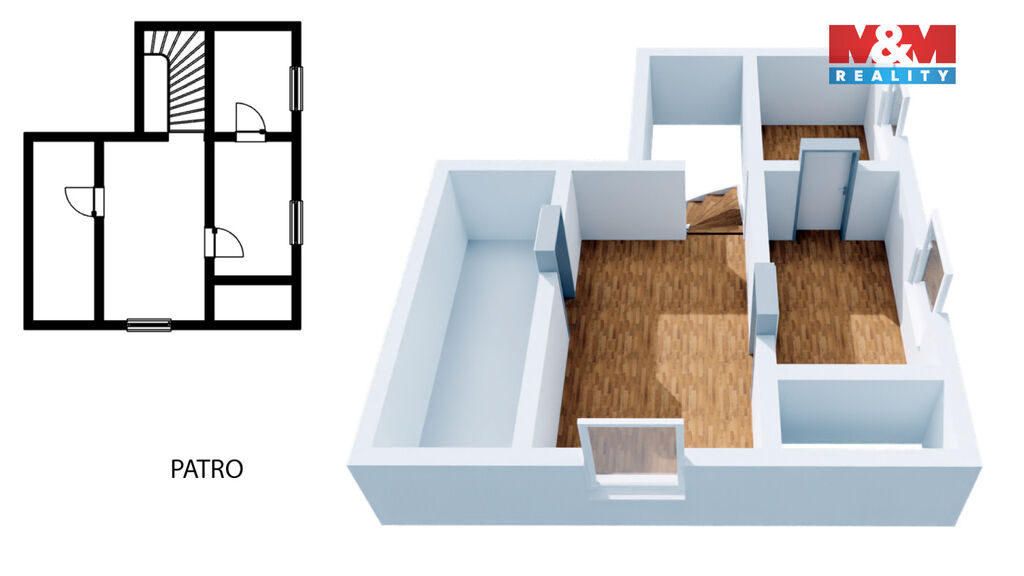 V prvním patře dva průchozí pokoje se šatnou a možnost vybudování dalšího pokoje.