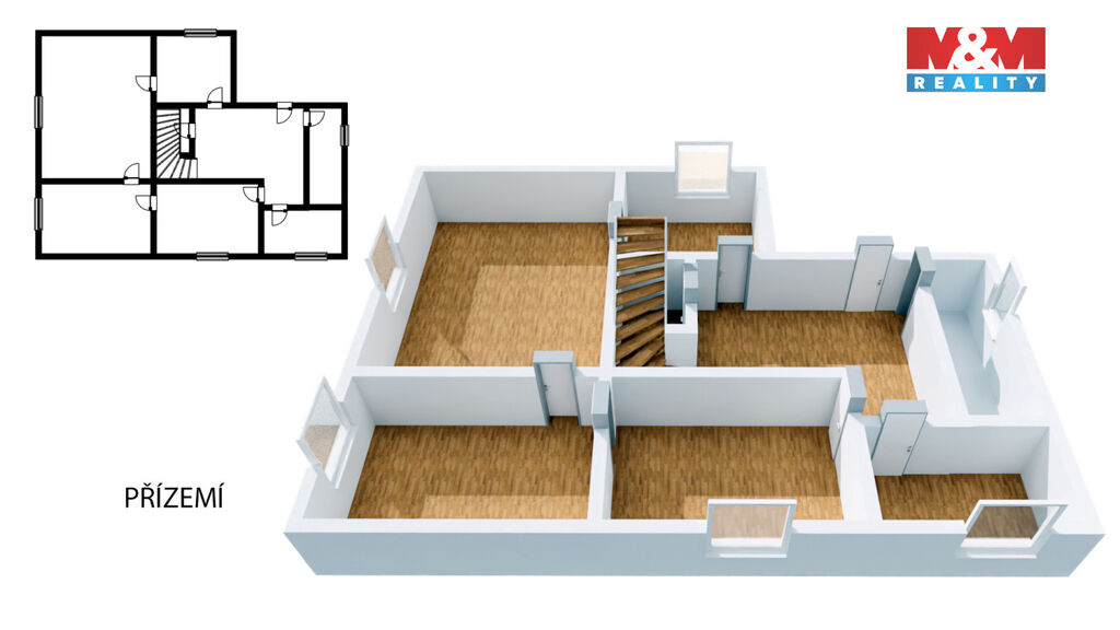 V přízemí se nachází tři samostatné pokoje, kuchyň, jídelna, WC, koupelna.
