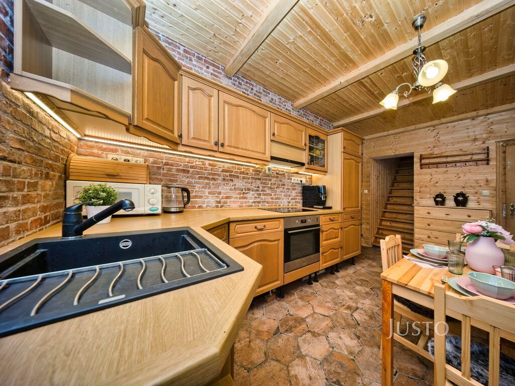V kuchyňské lince, která je z masivu, jsou zabudované vestavěné spotřebiče jako horkovzdušná trouba, myčka, sklokeramická deska, lednice s mrazákem a digestoř.