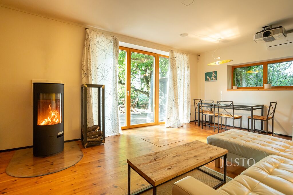 ● V obývacím pokoji je prostorná pohovka, knihovna a krbová kamna. Zažijete praskající oheň v krbu, který vrhá hřejivou záři po celé místnosti.