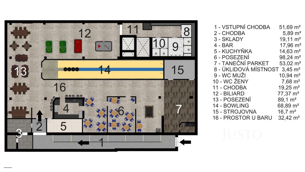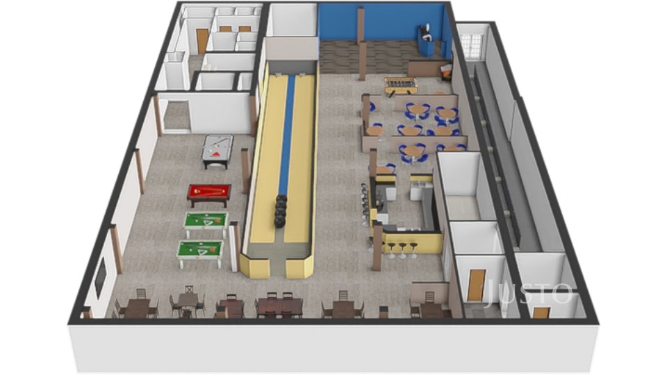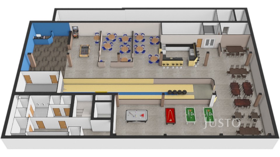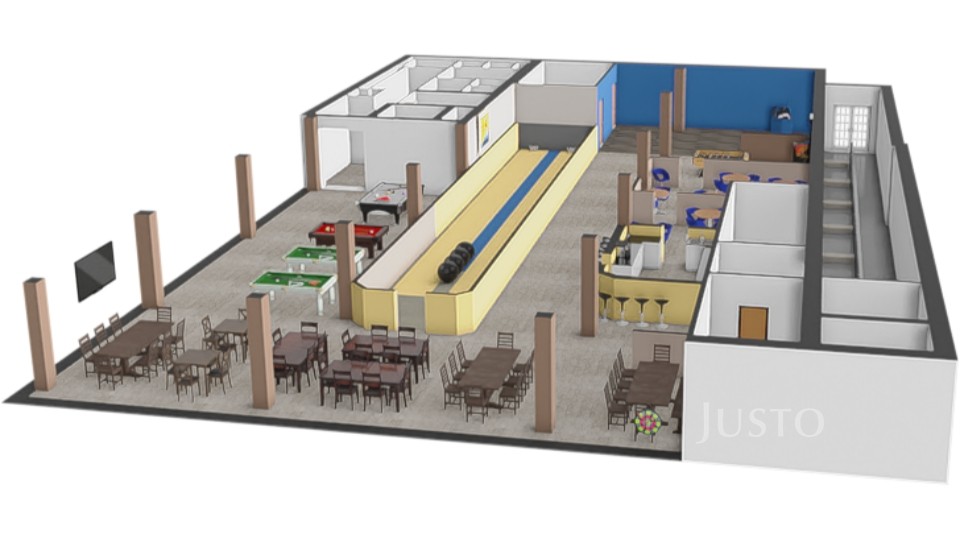 Součástí hlavního prostoru, který o velikosti 576 m² jsou dvě bowlingové dráhy, čtyři kulečníkové stoly, a cca 100 míst na sezení u stolů a na baru. V zadní části se nachází menší taneční parket a toalety pro hosty. U vstupu napravo v hlavním prostoru je pak situován výčep s barem. Na hlavní prostor navazují menší skladové a technické místnosti.