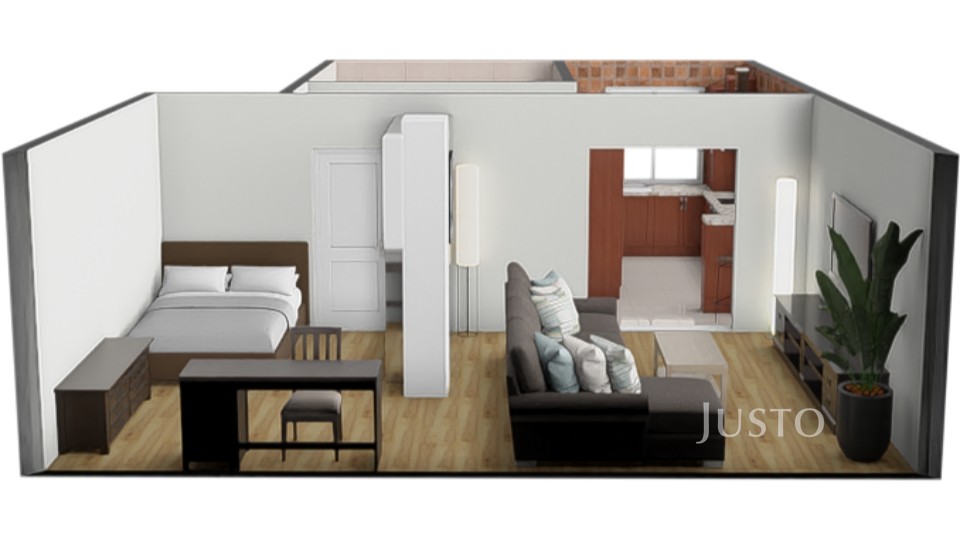 Při vstupu do bytu je předsíň, ze které je vstup do velké koupelny se dvěma okny, ve které je masážní, rohová vana, dvě umyvadla, toaleta a bidet. V čele bytu je kuchyně s prostornou kuchyňskou linkou vč. spotřebičů a např. i drtičem odpadu ve dřezu. Ze dvou obytných místností je nyní jedna, která je předělena šatní skříní.