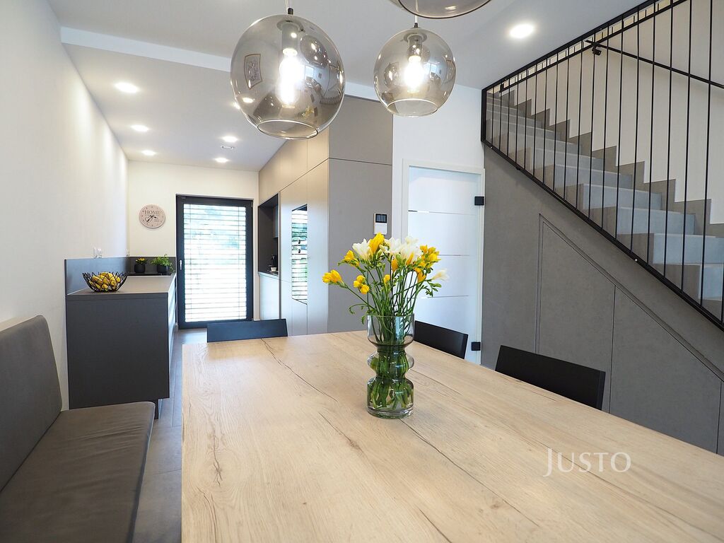 - Interiér domu je vybaven kvalitním nábytkem a prvky zhotovenými na míru, které podtrhují moderní vzhled a zajišťují maximální funkčnost