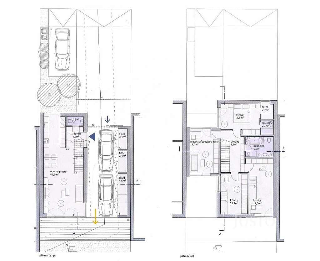 - prostorná dvougaráž o výměře 36,1 m² a dvě vyhrazená parkovací stání u domu, což zajišťuje pohodlné a bezpečné parkování