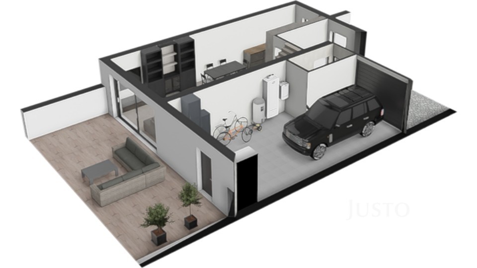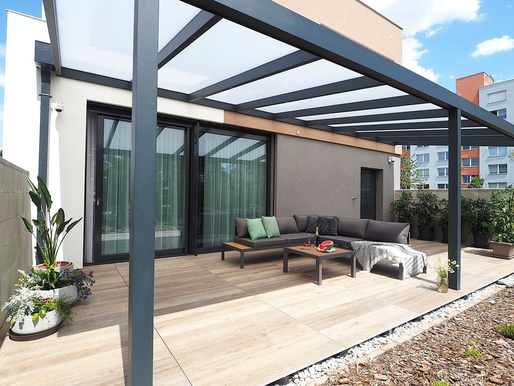 - Oplocená zahrada s terasou orientovanou na jih, která zajišťuje dostatek slunce po celý den a příjemné místo pro odpočinek, grilování či rodinná posezení