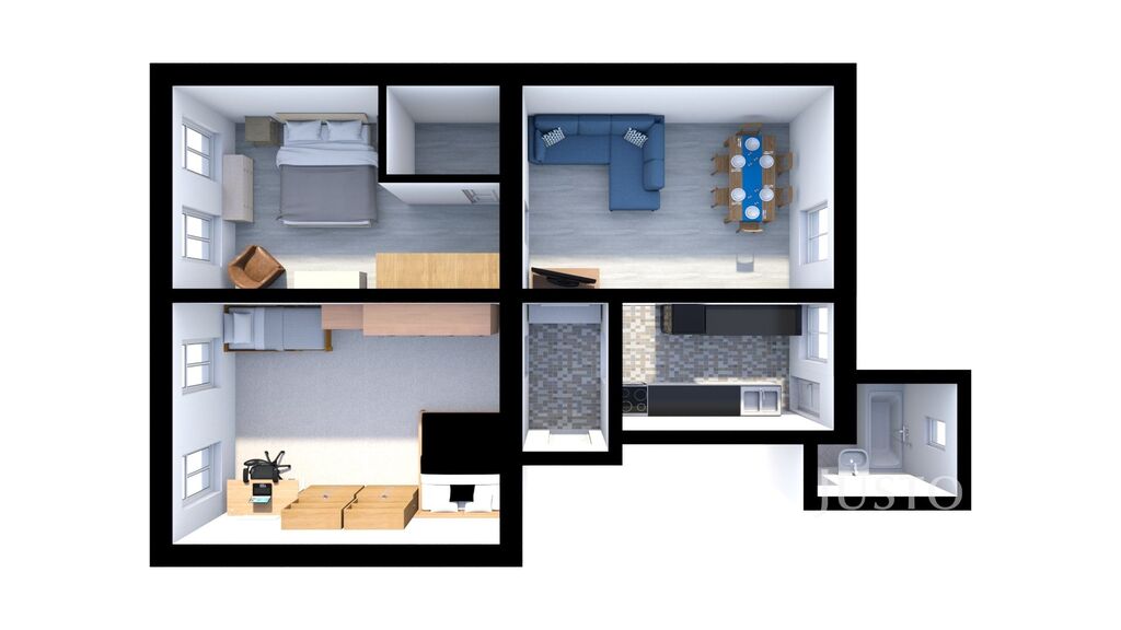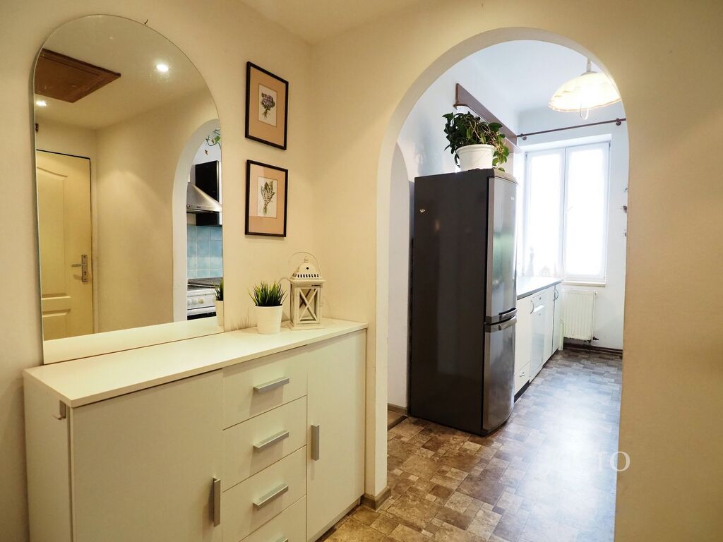 V zastoupení majitele nabízíme k prodeji byt o dispozičním řešení 3+kk na ul. Jeronýmova v Písku. Byt se nachází ve 2. NP domu. Před vstupem do bytu je praktická spižírna. Při vstupu do bytu je předsíň, ve které je místo na botník a předsíňový nábytek. Po pravé straně bytu s orientací do zahrady je kuchyňský kout a obývací pokoj. Tento útulný, praktický prostor vznikl přestavbou původní dispozice 2+1. Kuchyňský kout je od jídelní části a obývacího pokoje oddělena příčkou s průhledem, což dělá prostor vzdušným a světlým. Koupelna s oknem je s vanou a toaletou dohromady. V koupelně je tři roky starý plynový kotel, který zajišťuje vytápění bytu a ohřev vody. Vytápění bytu lze řešit i krbovou vložkou v obývací části. Dvě ložnice o výměře 23,3 m² a 17,1 m² jsou orientovány do ulice Jeronýmova. Menší ložnice má vestavěnou, velmi praktickou šatnu o výměře 2,9 m².