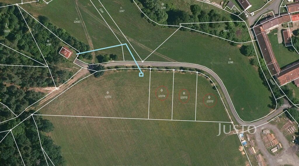 Přípojka obecní vody je již provedena tak, jak je označeno na mapě a fotografii ve fotogalerii, vedení přípojek k jednotlivým pozemkům je právně vyřešeno.