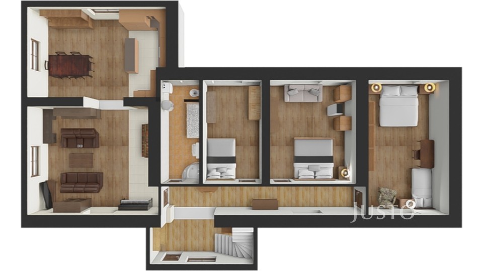 Tento prostorný vícegenerační dům prošel rozsáhlou a citlivou rekonstrukcí a je aktuálně rozdělen na dvě samostatná křídla, čímž nabízí možnost komfortního bydlení pro více rodin, kombinaci vlastního bydlení s pronájmem, případně i komerční využití.