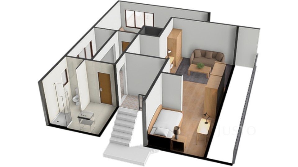 2. NP: kuchyně, ložnice, obývací pokoj, koupelna a WC.