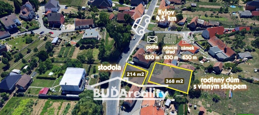 Prodávané 2 pozemky se nachází v centrální části obce. Jejich součástí je rodinný dům a stodola, které jsou určené spíše k demolici. Pozemek, kde stojí dům, má výměru 368 m2. V zadní části zahrady se nachází vinný sklep umístěný v zemi, je ve velmi dobrém stavu Má délku 10- 12 m. Stěny jsou obloženy cihlami. Stodola, která se nachází u hlavní cesty, je oddělena od pozemku s domem obecní komunikací. Jeho výměra činí 214 m2. Tento pozemek je určen pro drobnou výrobu, skladování. Stodola nemá č.e. ani č.p.