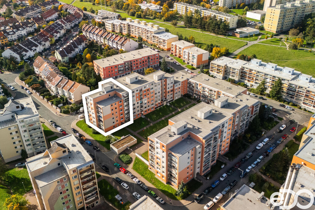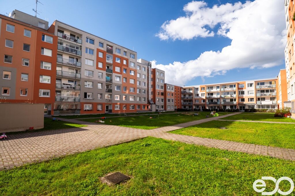 Dispozice je praktická a funkční – obývací pokoj s kuchyňským koutem a vstupem na lodžii, ložnice orientovaná do vnitrobloku a koupelna s vanou a toaletou.