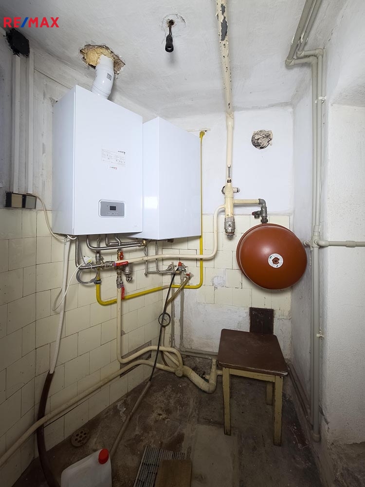 Vytápění: plynový kotel, výměnek vytápěn kamny
