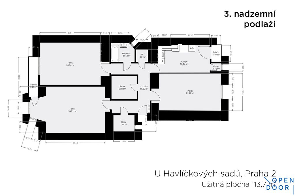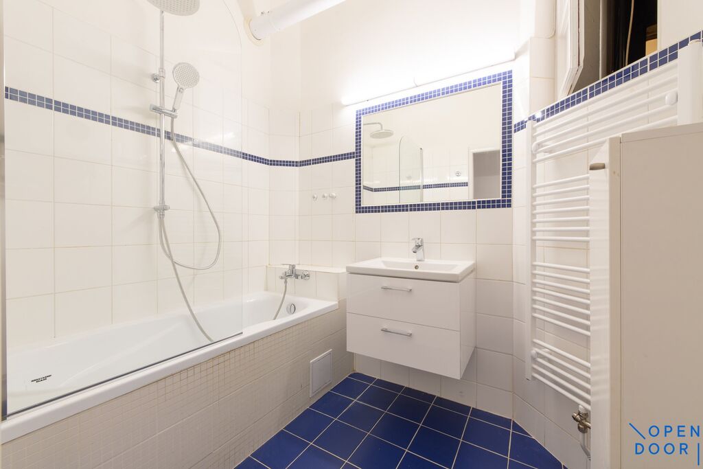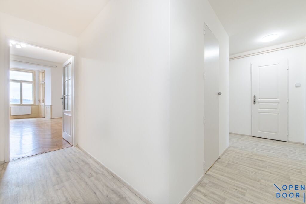 Byt nabízíme jako částečně vybavený. Všechny místnosti bytu jsou přístupné z prostorné haly - dva pokoje se společným balkonem mají nádherný výhled do Havlíčkových sadů a další pokoj a kuchyň s menším balkonem směřují do klidného vnitrobloku. Kuchyně je vybavena moderní kuchyňskou linkou se spotřebiči (vestavěná myčka nádobí, elektrický sporák s varnou deskou a troubou, volně stojící lednice s mrazákem), součástí kuchyně je malá komora. Koupelna je s vanou, WC samostatně. Z haly je dále přístupná velká šatna a další komora. Na podlahách pokojů jsou původní renovované parkety. Topení a ohřev vody plynovým kotlem umístěným v koupelně.