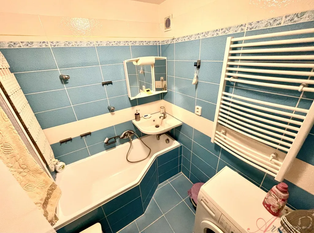 Podlahovou krytinu v celém bytě tvoří koberce, v sociálním zařízení je dlažba. Zděné koupelně dominuje vana se sprchovou zástěnou, součástí je také pračka.