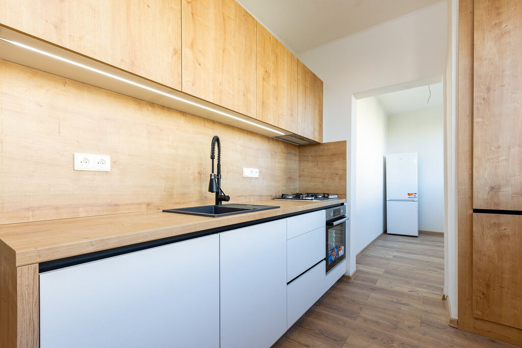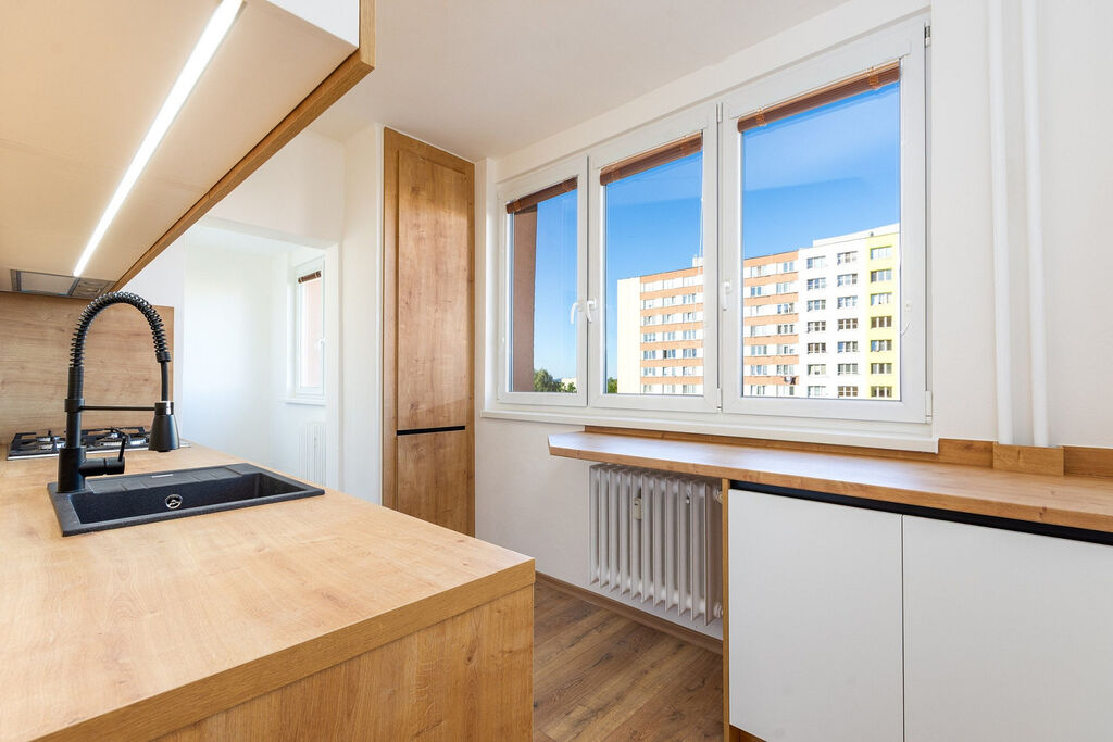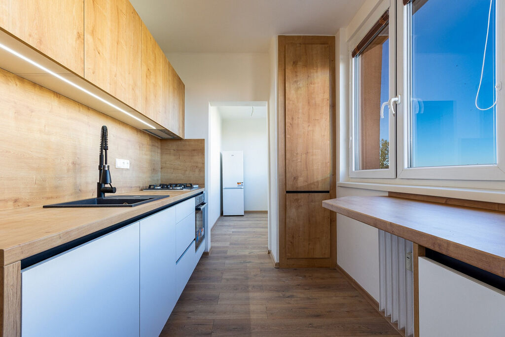 Dovolujeme si Vám nabídnout k pronájmu byt o velikosti 3,5+1 s dvěma lodžiemi v Ostravě - Zábřehu. Byt se nachází v 5. patře z 11. V domě jsou dva výtahy. Je po kompletní vkusné rekonstrukci. Nové podlahy, zděné jádro, krásná koupelna s vanou, toaleta, kompletně nová elektroinstalace v celém bytě. Nová stylová kuchyňská linka na míru včetně spotřebičů - myčka, trouba, varná deska, lednička. Kuchyň má dostatek odkládacího i pracovního prostoru. V předsíni je velká vestavná skříň.