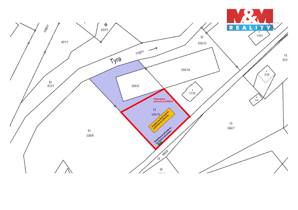 Nabízíme k prodeji pozemek k bydlení o rozloze 1000 m², nacházející se v katastrálním území Tyra, v klidné části obce. Tento pozemek představuje ideální příležitost pro výstavbu rodinného domu v malebném prostředí s dostatkem soukromí a klidu. Pozemek je ve velmi dobrém stavu, připravený k realizaci Vašich stavebních představ. Výhodná poloha nabízí nejen klidné bydlení, ale také snadnou dostupnost všech potřebných služeb a infrastruktury. Pokud hledáte místo pro svůj vysněný domov, tento pozemek je tou pravou volbou. Pro pozemek je vyřízený projekt včetně stavebního povolení. Stavět se může okamžitě. Neváhejte nás kontaktovat pro více informací a domluvení prohlídky. Těšíme se na Vaši odezvu!