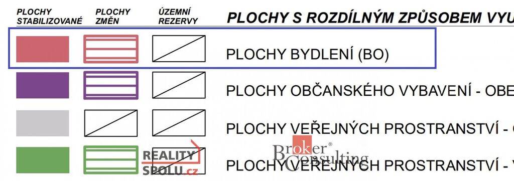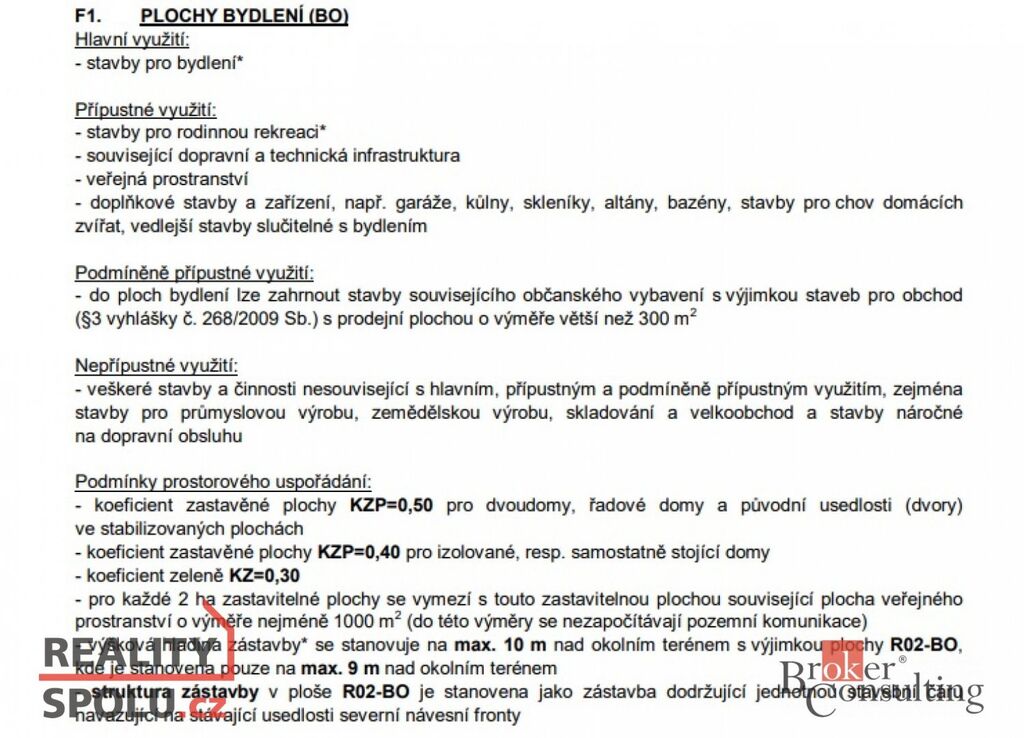 Pozemek je veden jako plocha k bydlení, umožňující zastavěnost až 40% při samostatně stojícím domu a max. výšku budovy 10 m.