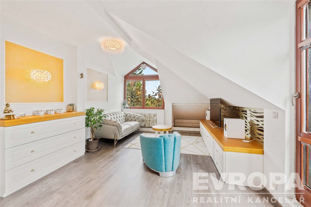 Vstupní chodba, koupelna s toaletou, obývací pokoj s na míru vyrobenou výsuvnou manželskou postelí, kuchyňský kout vybavený vestavěnými spotřebiči značky Miele, samostatný pokoj a komora.