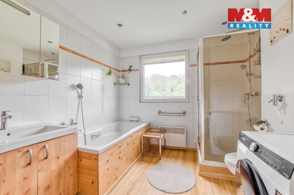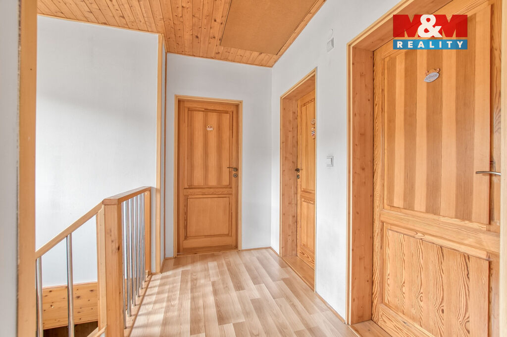 V přízemí domu je prostorná chodba se skříní a úložným prostorem, samostatné wc a schodištěm se dostaneme do prvního patra, kde jsou tři samostatné pokoje, z toho ze dvou se dá vyjít na balkón, odkud Vás nadchne výhled na Lysou horu. V horním patře je koupelna, jak se sprchovým koutem, tak i vanou, takže si každý přijde na své a k tomu další wc.