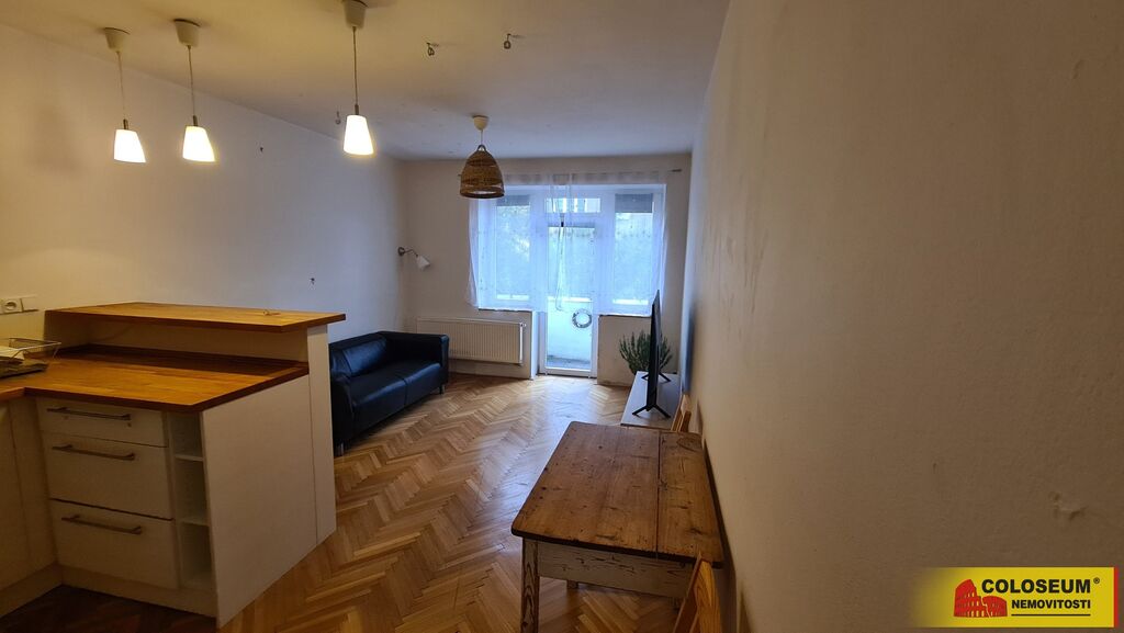 Obývací pokoj s kuchyňským koutem a přímým vstupem na balkon, ideální na ranní kávu.