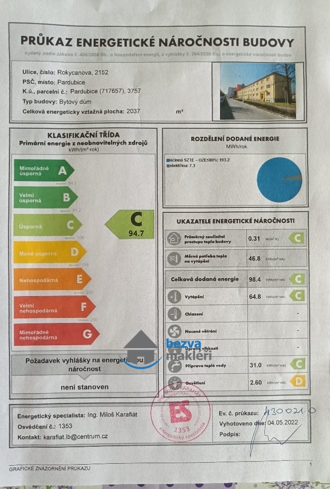 | Ukazatel energetické náročnosti | 94.7 kWh/m2 za rok |