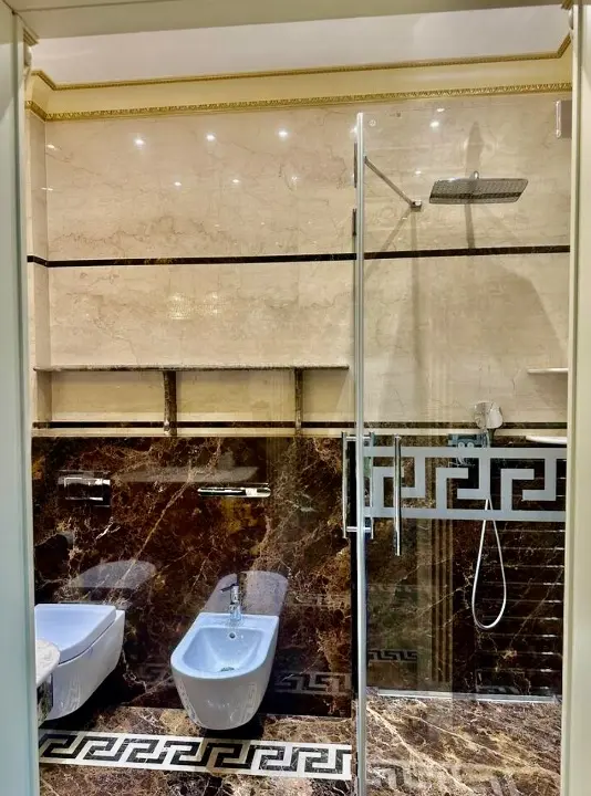 V obou koupelnách je podlahové vytápění, obklady i podlahy jsou z luxusního mramoru.