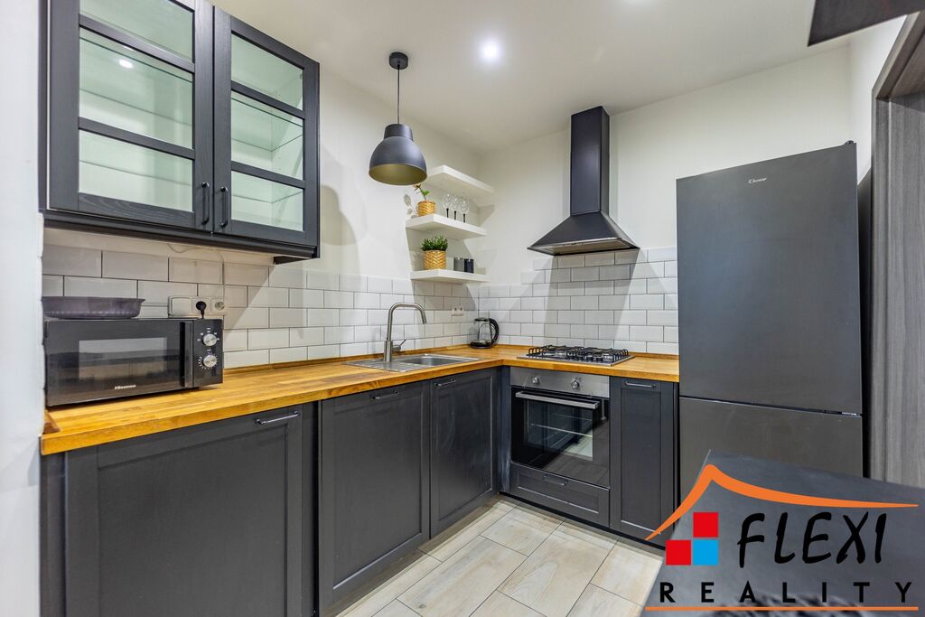 Součástí kuchyně je vkusná kuchyňská linka černé barvy s pracovní deskou v dekoru dřeva a vestavěnými spotřebiči, jako je myčka, horkovzdušná trouba, plynový sporák, mikrovlnná trouba, lednice s mrazákem a také pračka. A najdete zde i praktickou komodu s policemi a šuplíky.