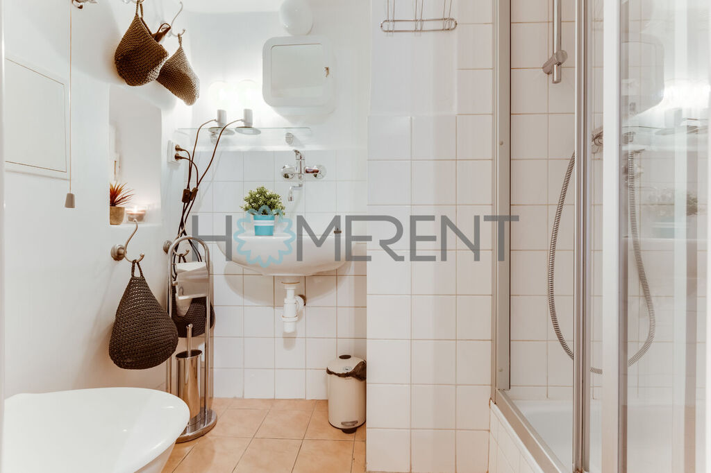 Byt tvoří samostatná ložnice a kuchyně s jídelním koutem, samozřejmostí je koupelna se sprchovým koutem. Interiér působí útulně a má nezaměnitelný charakter díky malovanému stropu, dřevěným trámům a rustikálním doplňkům, které bytu dodávají atmosféru staré Prahy. Stylové dřevěné dveře a původní detaily vytvářejí pocit domova s duší a historií.