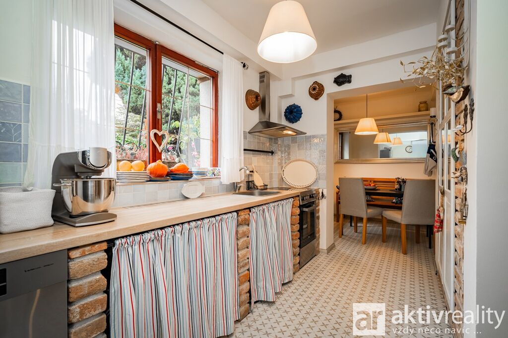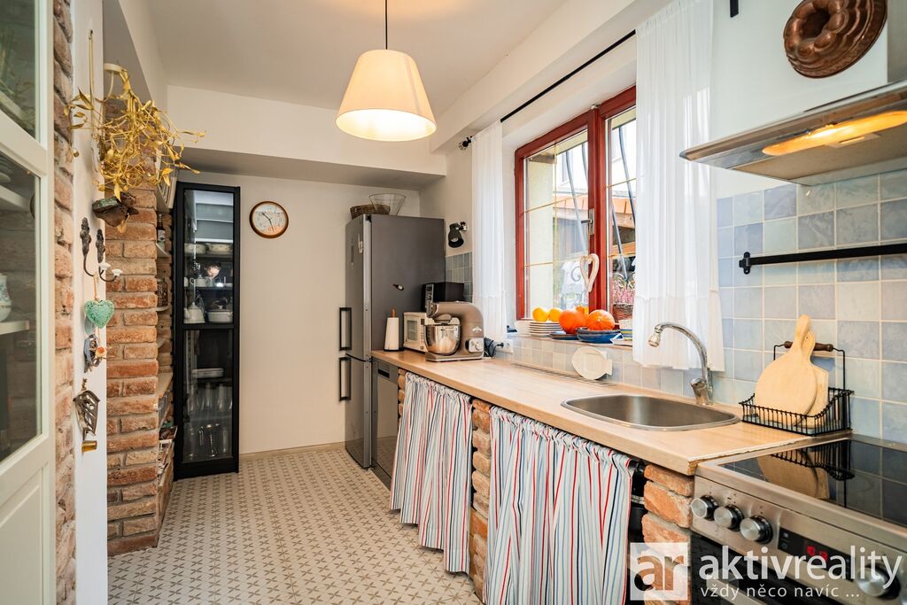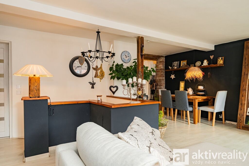Obytná část domu o dispozici 2+1 nabízí možnost pohodlného bydlení nebo dalšího pronájmu s ročním výnosem 240 000,- Kč. V přízemí se nachází vstupní chodba, technická místnost s místem pro pračku a sušičku, špajz a kuchyně s jídelnou s výhledem do dvora. Po dřevěném schodišti vystoupáte do patra, kde je prostorný obývací pokoj s krbovými kamny, ložnice a koupelna se sprchovým koutem i vanou (aktuálně v rekonstrukci).