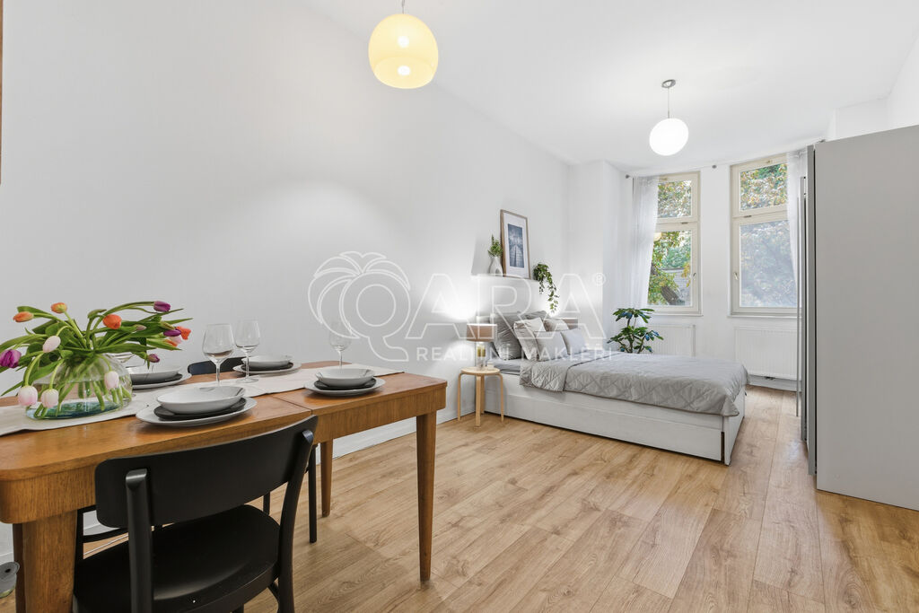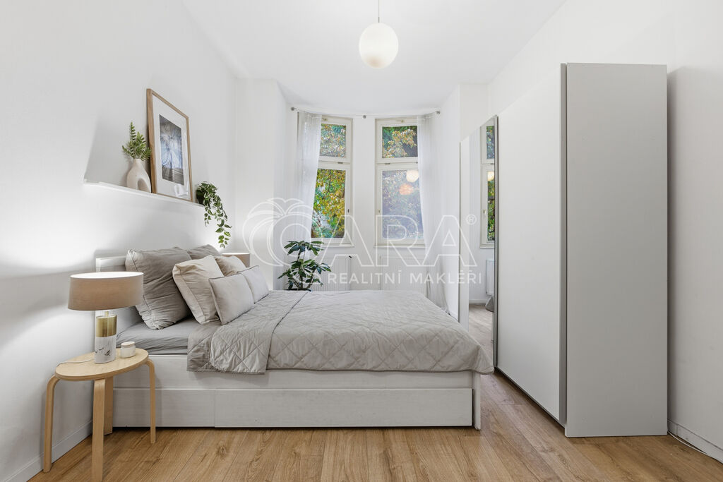 Ve druhém podlaží cihlového domu najdete prostor, který si zachoval charakter staré Prahy – vysoké stropy, dřevěná okna a výhled do zeleného vnitrobloku, kam mají přístup všichni obyvatelé domu. Místo, kde se dá na chvíli zpomalit a nadechnout.