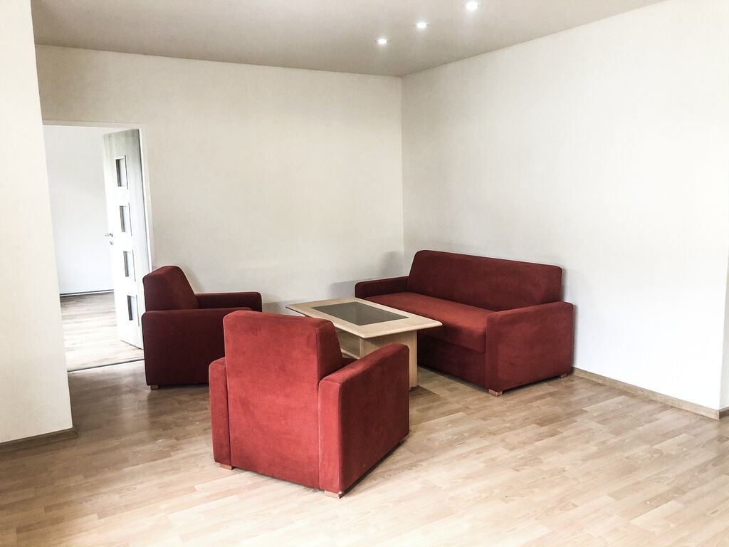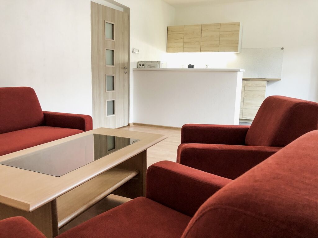 Vnitřní dispozice bytu: vstupní chodba, vybavená kuchyň s moderními spotřebiči (varná deska, lednice, trouba, mikrovlná trouba) spojená s obývacím pokojem, ložnice, pokoj, koupelna s vanou a toaleta. Byt je částečně vybaven. Vysokorychlostní internet (není v ceně).