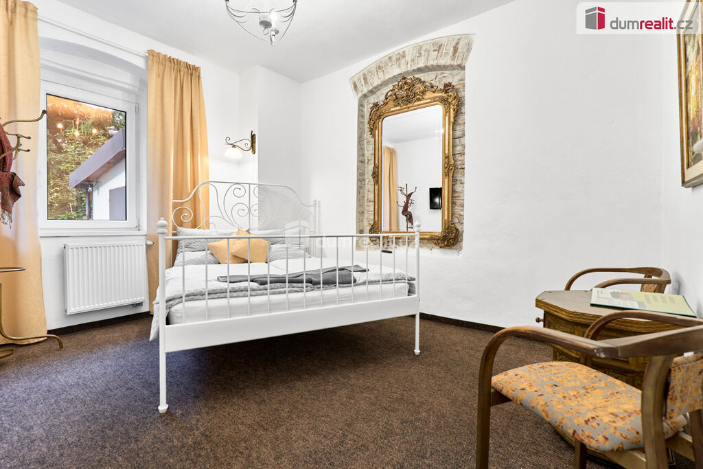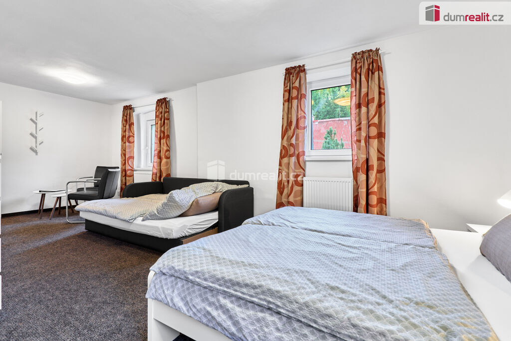V exkluzivním zastoupení nabízíme k prodeji penzion v Krušných horách, v nádherné lokalitě u lesa a v těsné blízkosti lázeňského města Jáchymov. Částečně podsklepený objekt je po celkové rekonstrukci vč. veškerých rozvodů, zateplení a protiradonového opatření. Vytápěn je automatickým kombinovaným kotlem s podavačem na pelety, pitná voda je z vlastního vrtu a odpady jsou svedeny do vlastní ČOV.