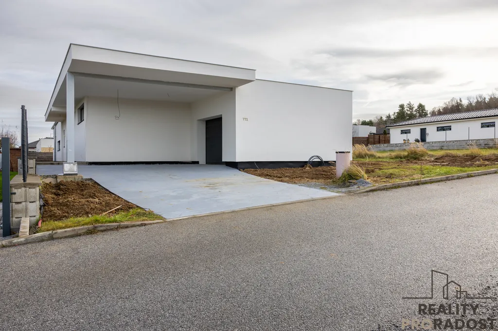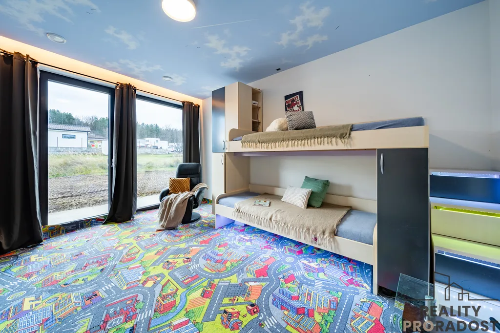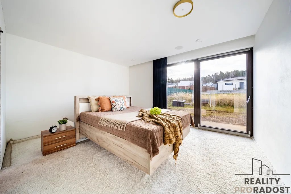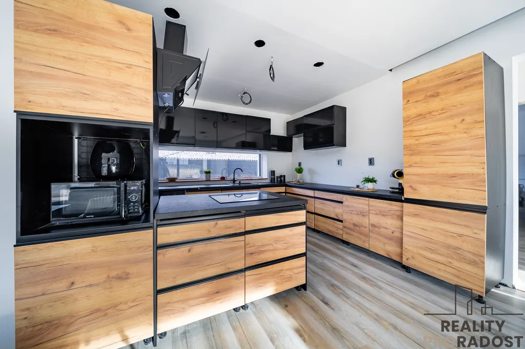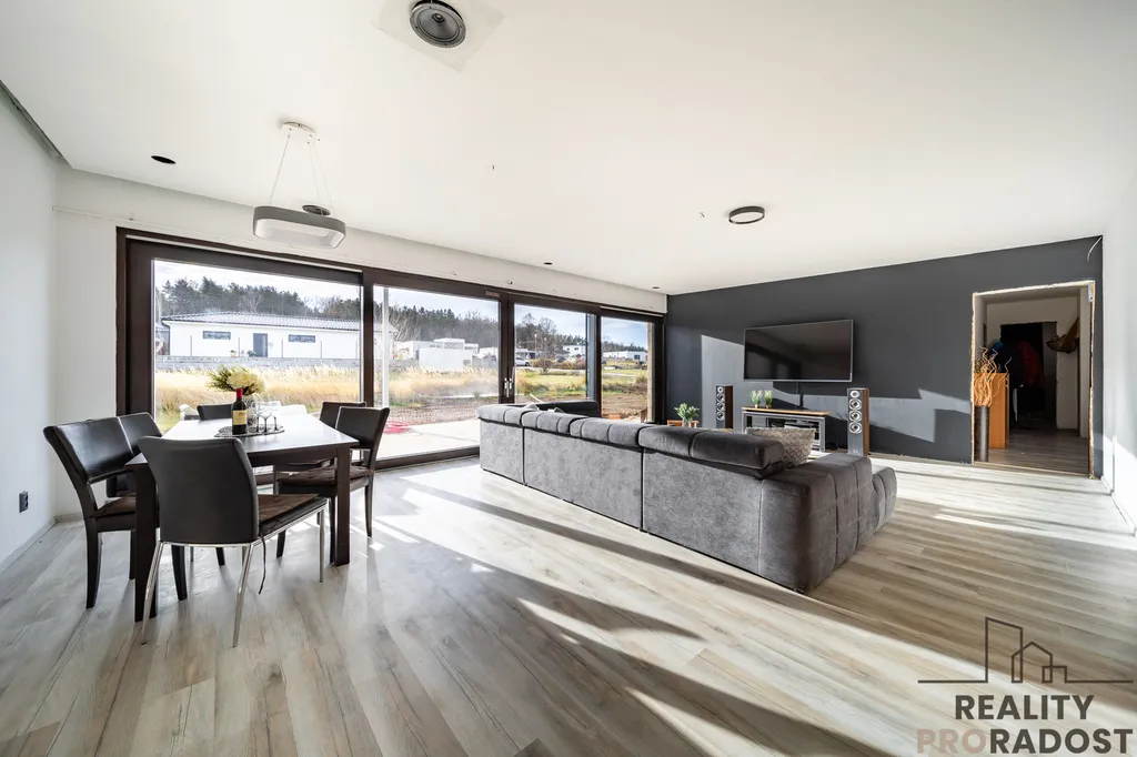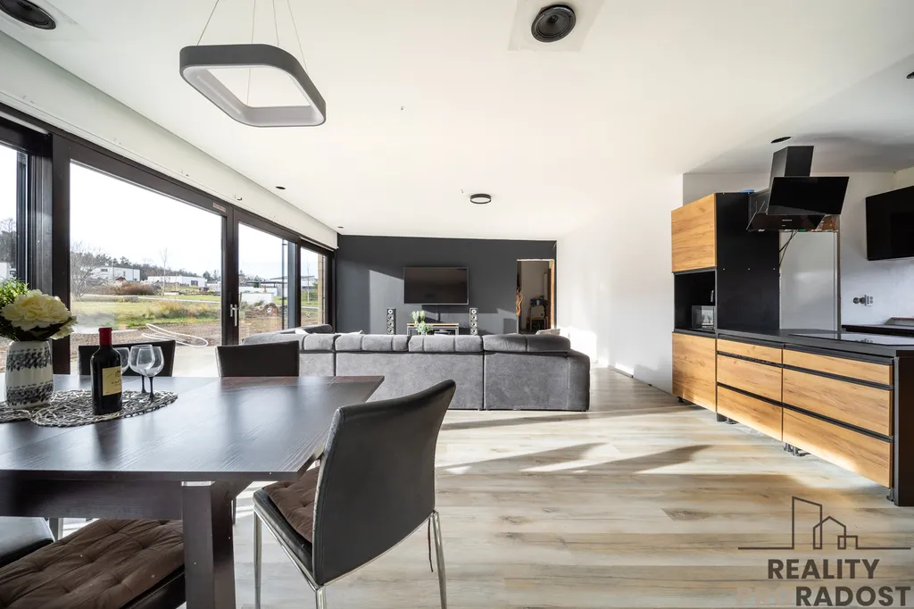 Novostavba rodinného domu 5+kk s garáží na lukrativním místě ve Včelné u Českých Budějovic. Tento dům je výsledkem architektonického studia pana Vostrackého a poznáte to zde na každém detailu. Jeho prosklená jižní část s obrovskými francouzskými okny HS-portal Vás jednoduše bude bavit. A to, jak si pan architekt pohrál s různými přesahy střechy, aby využil maximum slunečního svitu, aniž byste museli zatahovat venkovní elektrické rolety, resp. aby je chytrá domácnost od firmy LOXONE nemusela spouštět za Vás, je brilantní. Dům je prošpikovaný nejnovějšími technologiemi od této značky jako je tepelné čerpadlo (země - voda), pasivní chlazení, vynikající audio systém s reproduktory v každé místnosti, příprava na rekuperaci a příprava na ohřev bazénu a jiné. Je zde i příprava na teplovodní krb. Dispozice domu nabízí dva dětské pokoje na jedné straně, uprostřed dominantu v podobě obrovského obývacího pokoje s místem na krb se zadním přikládáním a s kuchyní a na protější straně dvě ložnice s druhou koupelnou. Dalšími benefity jsou prostorná šatna a garáž + venkovní kryté stání. Dále je potřeba zmínit vinylové podlahy, HS-portal v kombinaci dřevo-hliník ve třech pokojích se vstupem na zahradu, na střeše plastovou folii a zahradu o rozloze 611 m2, která čeká na Vaše nápady. Dům najdete ve slepé ulici s klidovou zonou s ohništěm a dětským hřištěm uprostřed, takže své ratolesti můžete bez starostí nechat řádit na ulici. V domě zbývá zbudovat krb, oplotit pozemek a dokončit zahradu dle Vašich představ. Dům se prodává v aktuálním stavu. Dle přání kupujícího může být dodána nová kuchyně, dodělána druhá koupelna, vyměněny podlahy i dodány interiérové dveře, jejichž cena není součástí kupní ceny. Více informací v RK.