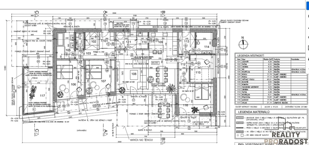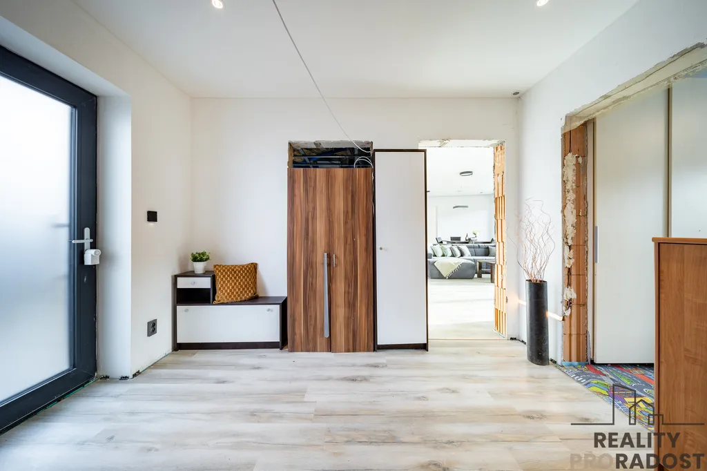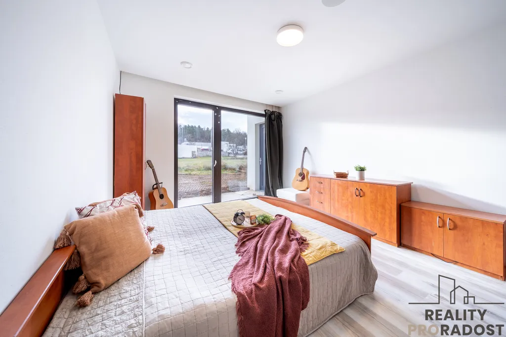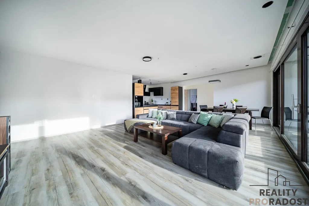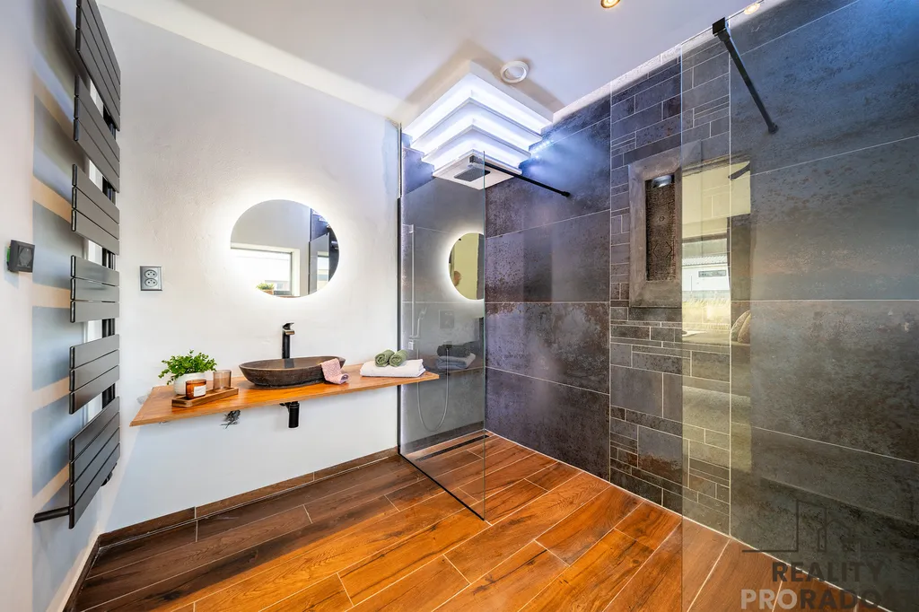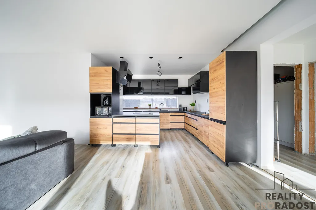 Novostavba rodinného domu 5+kk s garáží na lukrativním místě ve Včelné u Českých Budějovic. Tento dům je výsledkem architektonického studia pana Vostrackého a poznáte to zde na každém detailu. Jeho prosklená jižní část s obrovskými francouzskými okny HS-portal Vás jednoduše bude bavit. A to, jak si pan architekt pohrál s různými přesahy střechy, aby využil maximum slunečního svitu, aniž byste museli zatahovat venkovní elektrické rolety, resp. aby je chytrá domácnost od firmy LOXONE nemusela spouštět za Vás, je brilantní. Dům je prošpikovaný nejnovějšími technologiemi od této značky jako je tepelné čerpadlo (země - voda), pasivní chlazení, vynikající audio systém s reproduktory v každé místnosti, příprava na rekuperaci a příprava na ohřev bazénu a jiné. Je zde i příprava na teplovodní krb. Dispozice domu nabízí dva dětské pokoje na jedné straně, uprostřed dominantu v podobě obrovského obývacího pokoje s místem na krb se zadním přikládáním a s kuchyní a na protější straně dvě ložnice s druhou koupelnou. Dalšími benefity jsou prostorná šatna a garáž + venkovní kryté stání. Dále je potřeba zmínit vinylové podlahy, HS-portal v kombinaci dřevo-hliník ve třech pokojích se vstupem na zahradu, na střeše plastovou folii a zahradu o rozloze 611 m2, která čeká na Vaše nápady. Dům najdete ve slepé ulici s klidovou zonou s ohništěm a dětským hřištěm uprostřed, takže své ratolesti můžete bez starostí nechat řádit na ulici. V domě zbývá zbudovat krb, oplotit pozemek a dokončit zahradu dle Vašich představ. Dům se prodává v aktuálním stavu. Dle přání kupujícího může být dodána nová kuchyně, dodělána druhá koupelna, vyměněny podlahy i dodány interiérové dveře, jejichž cena není součástí kupní ceny. Více informací v RK.