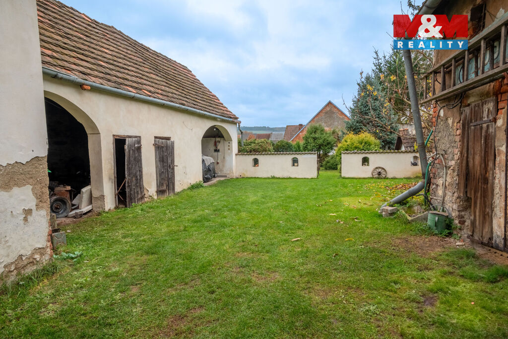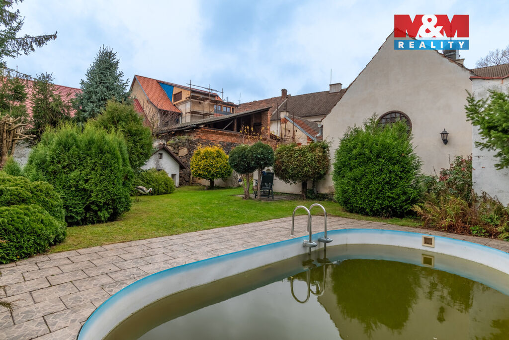 Na uzavřeném dvoře se nachází parkování pro 2 vozy, zděná kolna a okrasná zahrada se zapuštěným bazénem (207 m²).