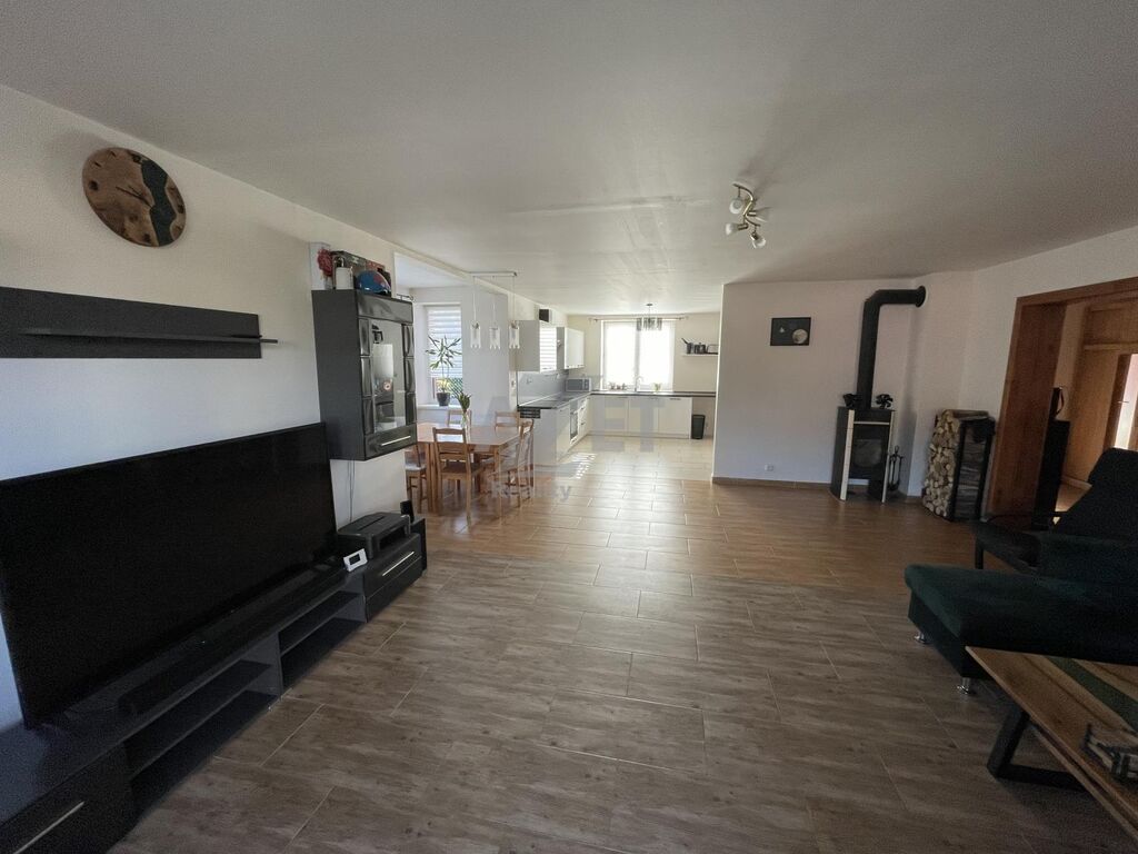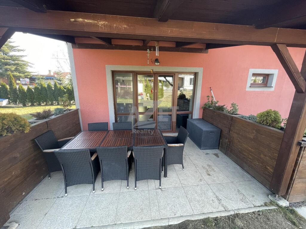 Prostorný obývací pokoj s krbovými kamny tvoří srdce domu a navazuje na moderní kuchyni vybavenou vestavěnými spotřebiči. Z obývací části je přímý vstup na zastřešenou terasu, ideální pro grilování, rodinné večeře i letní relax u bazénu.