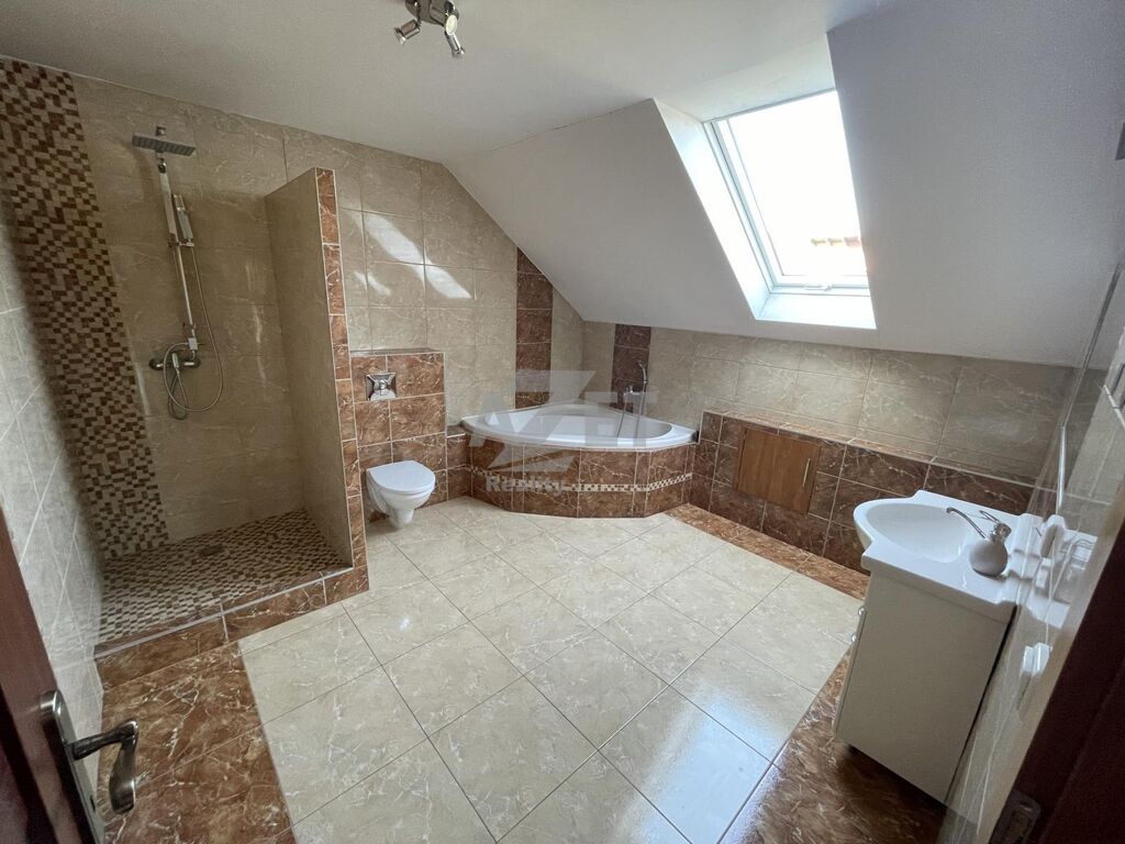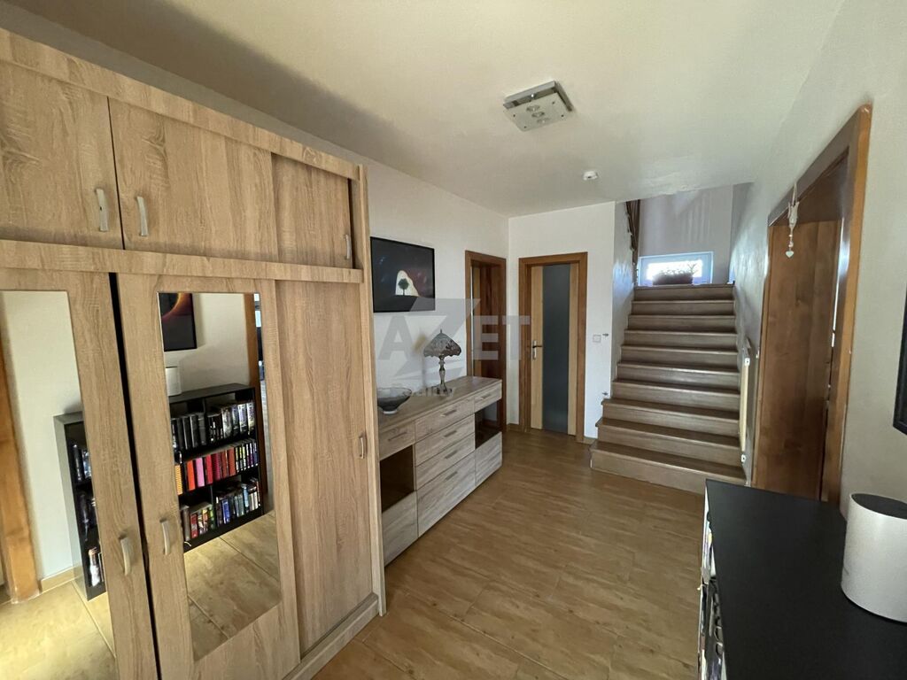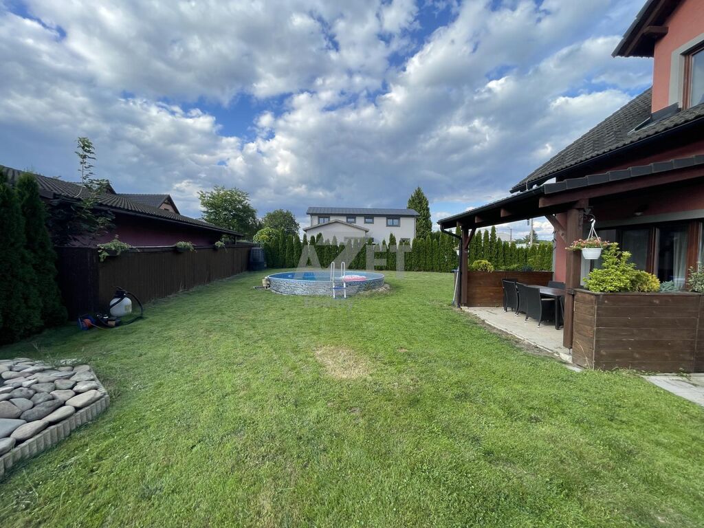 K dispozici je garáž, úložné prostory i systém pro vsakování dešťové vody. Dům je vytápěn plynovým kondenzačním kotlem a kryt betonovou střešní taškou s dlouhou životností.