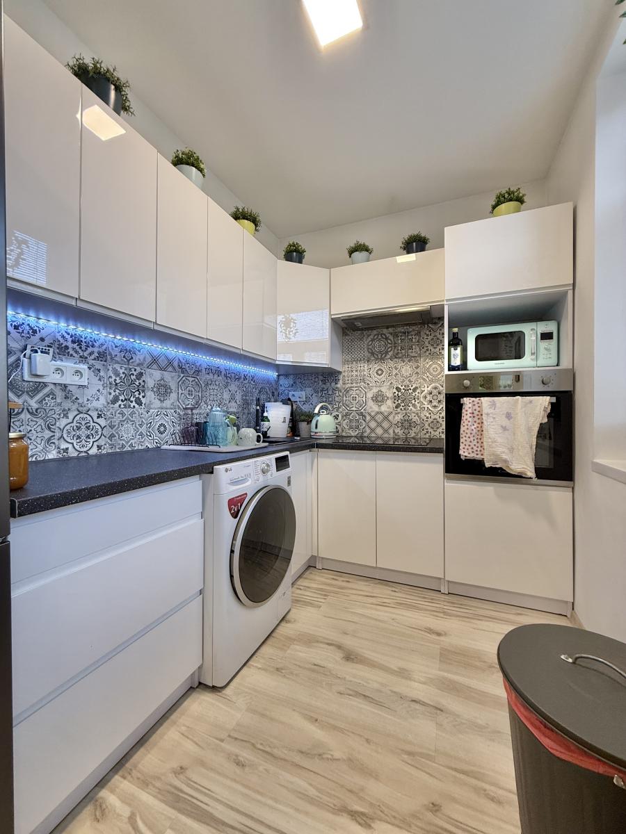 Kuchyně s moderní linkou a vestavěnými spotřebiči.